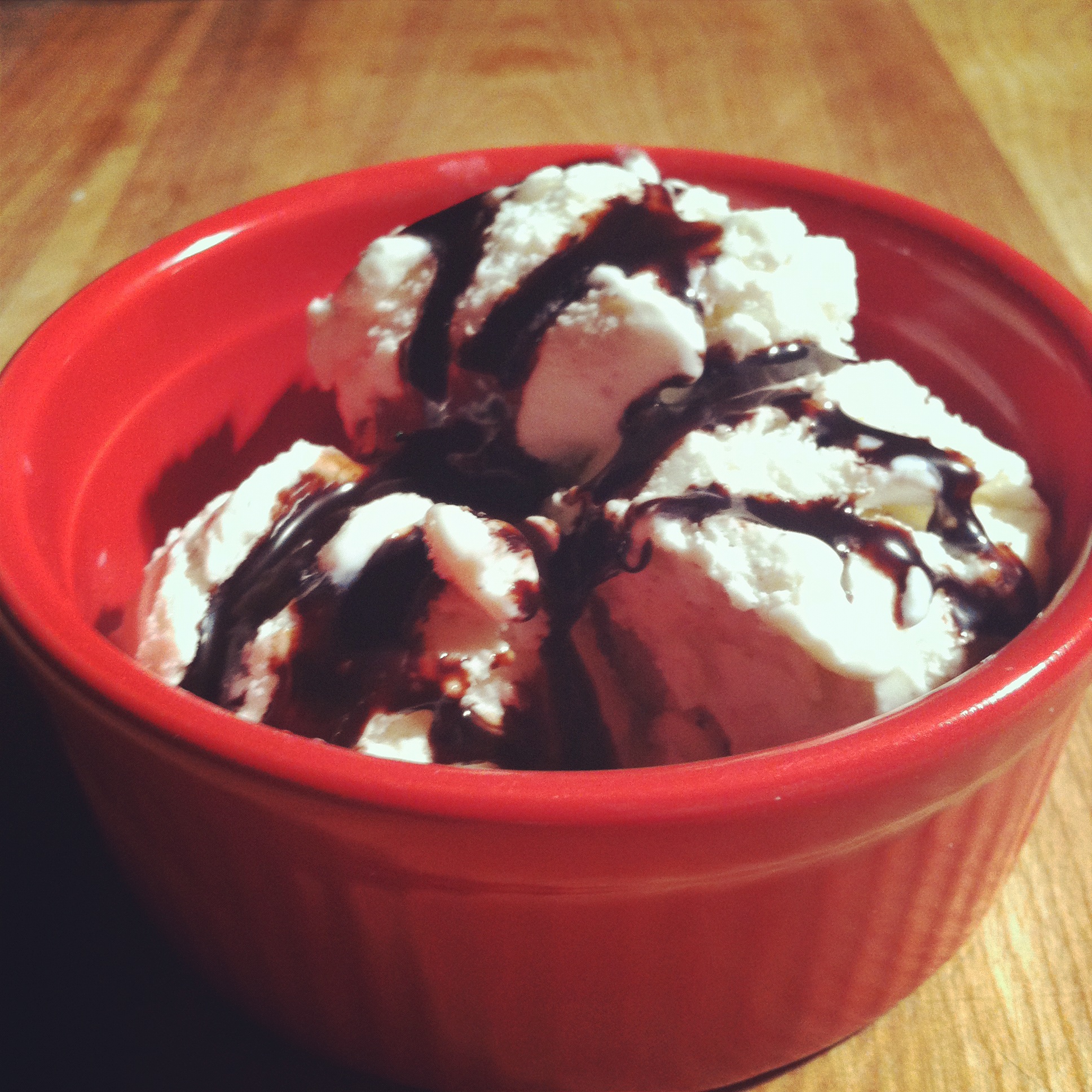 It’s so simple, but so good! Vanilla ice cream with Hershey’s chocolate syrup in a dish gave us room to dish about most anything.